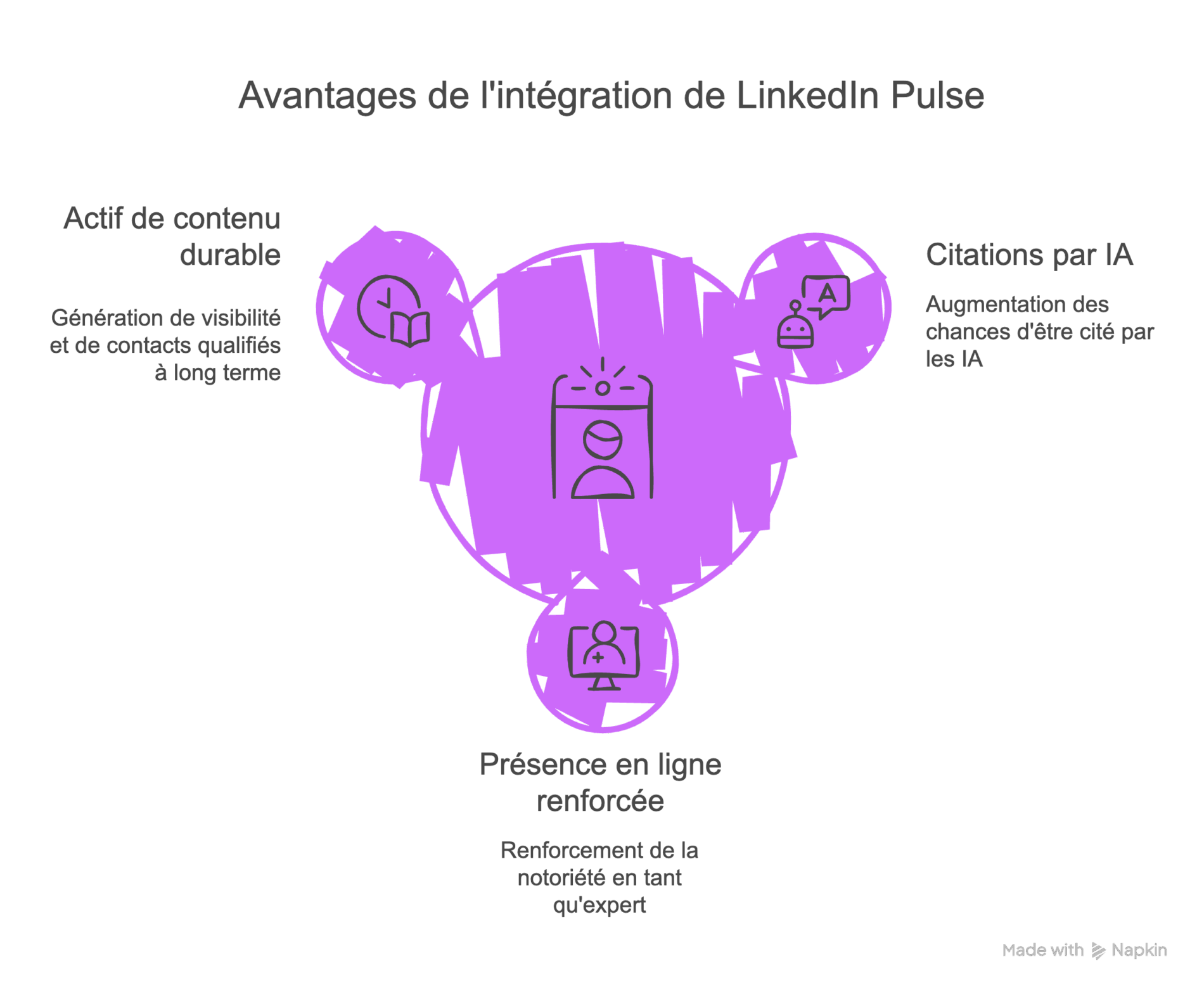 Intégrer LinkedIn Pulse dans votre stratégie de visibilité présente plusieurs avantages convergents. Le premier est évident au regard de l’étude SEMrush : en publiant régulièrement des articles Pulse de qualité, vous augmentez vos chances d’être cité par ChatGPT, Perplexity, Copilot et les autres IA lorsque des utilisateurs posent des questions liées à votre domaine d’expertise. C’est un canal d’acquisition de notoriété et de leads qui ne dépend pas du SEO traditionnel et qui résiste à l’érosion du trafic organique.
